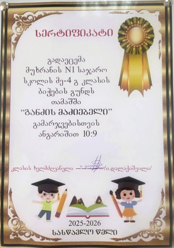 მუხრანის N1 საჯარო სკოლის IV-გ კლასში (კლასის ხელმძღვანელი: ია დალაქიშვილი), დიდი ინტერესითა და ხალისით განხორციელდა ინტელექტუალური თამაში “განძის მაძიებლები”.